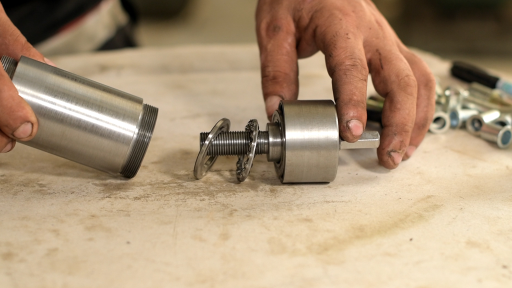 This system is placed in the tube that we made on the lathe of 52mm width. On the nut, there is a keyway in which there are two stable screws which are attached to the cylinder. Therefore, when the screw spins with the hexagon part, the nut is not able to be spun so it is dragged into the cylinder forward and backward accordingly whether we are screwing or unscrewing.