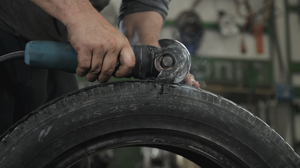 On the 0107 video, we are demonstrating how we are making the crawlers for a crawling chair that we are going to make in the next videos. Therefore, we chose a rubber crawler rather than a metallic one in order to achieve lighter weight, less noise and lower cost. Thus, we cut the sided parts taken from two car tyres and kept the central parts. Then, we divided it and punctured it in 27 equal distances, where there are the parts that the crawler is urged to move through a sprocket.