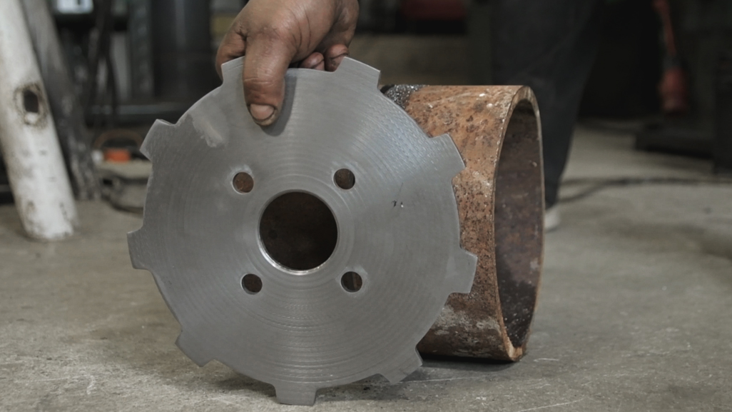 Afterwards, we made the two metallic wheels, on which the rubber crawler spins. At the centre of the one metallic wheel, we placed a nine-teeth sprocket that we made. Furthermore, we added another 4 smaller wheels that cause the stretching and suspension of the crawler. These wheels are metallic and polyurethane-layered as a result they are highly durable. They are supported on scissors that are connected with a spring so when the crawler finds an obstacle, the loads are absorbed by the spring.