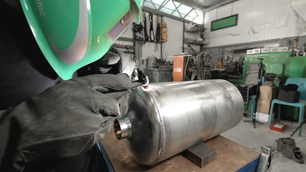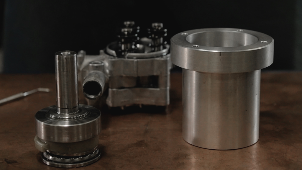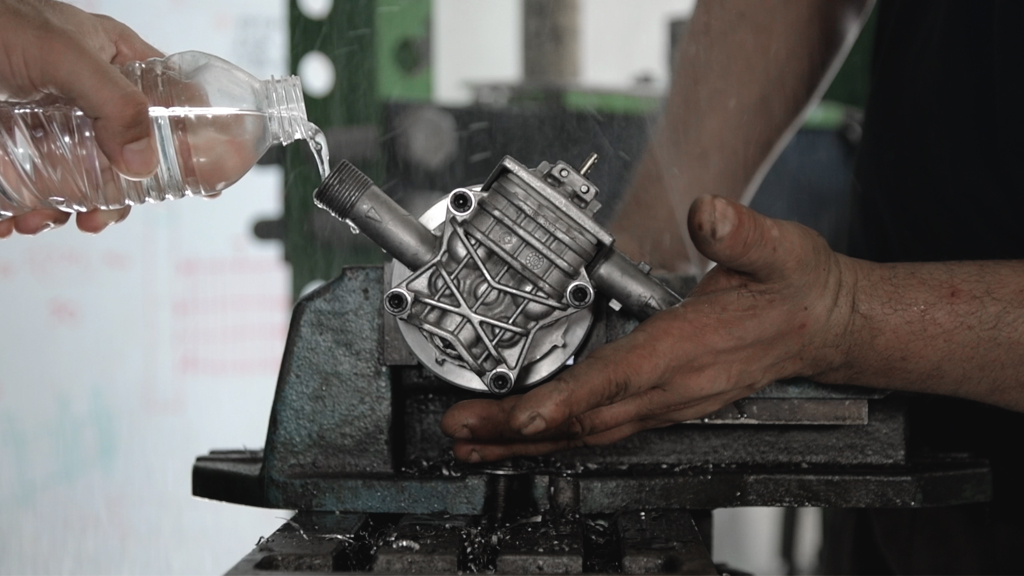 First of all, we removed the motor from an old, electric water compressor and we replaced it with an axis from a gear. The movement from the chainsaw’s engine is transmitted through a gear and a chain on the pump of the compressor that can transmit the water to the exit of the nozzle with pressure 140 bar. The nozzles can be changed according to the task that we need to undertake.