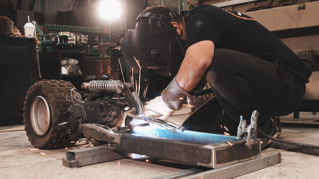 Rear Wheel: Quad bike rim and wide tire for improved stability and scooter-like geometry.