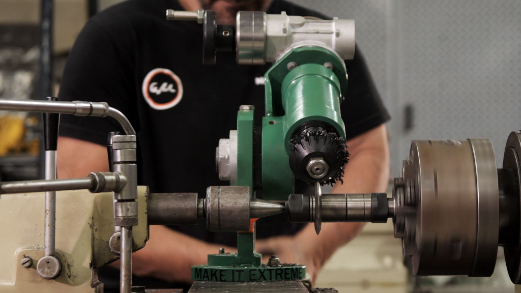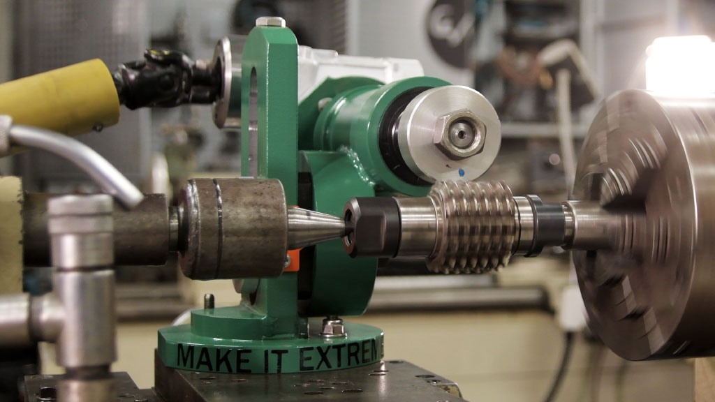 In this case, we connected a 50:1 ratio gearbox to the output where we placed the cutter. This means that when the input rotates 50 times, the output of the gearbox makes one full rotation. With this in mind, we created a base that mounts on the lathe’s tool post, which carries this gearbox. So, when the gearbox is connected to the output and the chuck rotates, the gearbox mounted on the tool post also rotates accordingly.