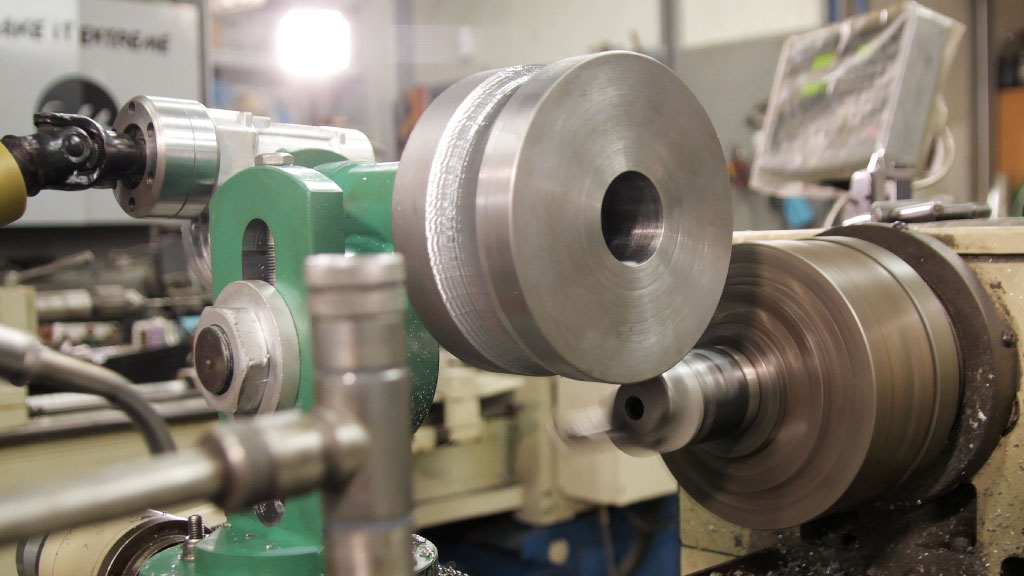 So, we came up with a mechanism that can be mounted on the lathe we already have and, using it, we can manufacture the gears we need. In a previous video of ours, number 0137, we took motion from the lead screw responsible for thread cutting and managed, through the rotation of the chuck, to achieve corresponding rotation of a shaft on the other side of the lathe. By attaching a cutter to this shaft and rotating the workpiece with the chuck, we were able to shape the cylindrical shaft into an octagon, hexagon, square, and many more, depending on the cutter and speed settings.